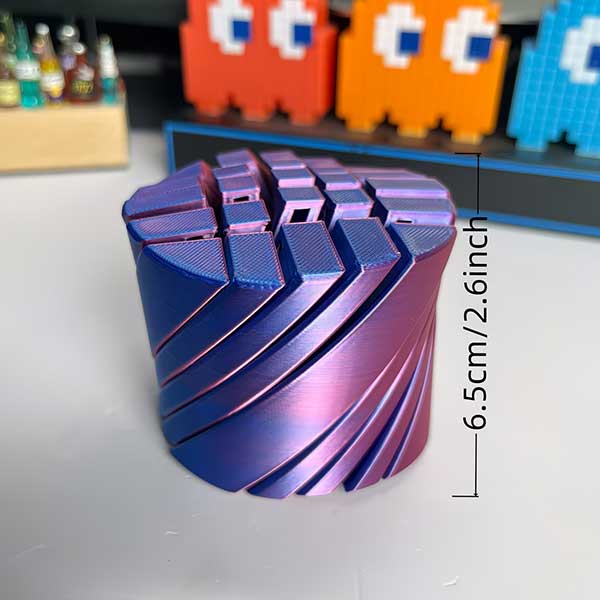 Plongez dans un état de flow instantané. Ce Cylindre de Flux 3D n’est pas un simple tube : c’est une prouesse d’impression 3D qui simule le mouvement d’un liquide en cascade. Idéal pour apaiser l’anxiété, il offre une stimulation visuelle hypnotisante qui aide à recentrer l’attention lors des moments de surcharge sensorielle ou de stress intense.